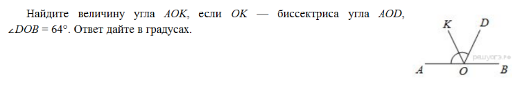 Ответ Автор - GhoSt . 1)угол AOD=180-64=116 (AOB- развернутый угол)2)угол AOK=116/2=58 (т. к. OK - биссектриса)