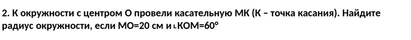 Ответ Автор - Darth ILS отрезок, соединяющий точку касания и центр окружности, всегда под прямым углом к касательной. Значит в треугольнике МОК - угол МКО - прямой, а МО - гипотенуза, значит ОК/МО = cos угла КОМ = 1/2 => ОК = 1/2 МО = 10.наверное так